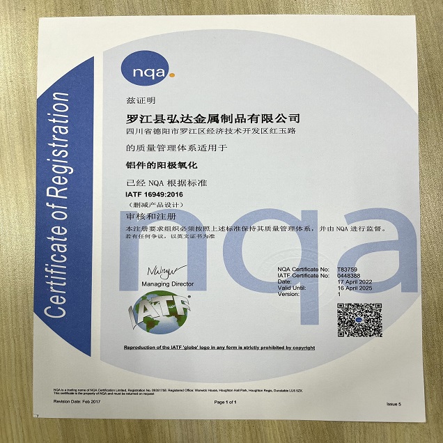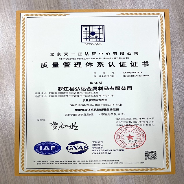 罗江县弘达金属制品有限公司成立于2016年6月,总投入资金3200万元,固定资产2600万元。是一家专业从事表面处理的科技先导型企业,配置有全自动的阳极氧化线一条(槽液容量30000升),全自动化学镍(槽液容量3600升)、碱性锌镍合金(槽液容量14000升)、碱性镀锌一体线(槽液容量7100升)组合线一条,镀硬铬(槽液容量9000升),设备运行采用先进的PLC控制,PC全自动实时监控各个参数指标及变频调速PID温度控制,目前成绵德三地先进的表面处理生产线,检测仪器采用德国菲希尔膜厚检测仪,精度可达到0.5um,硬度计采用电脑自动对焦取点,准确度高,自动打印数据安全可靠。